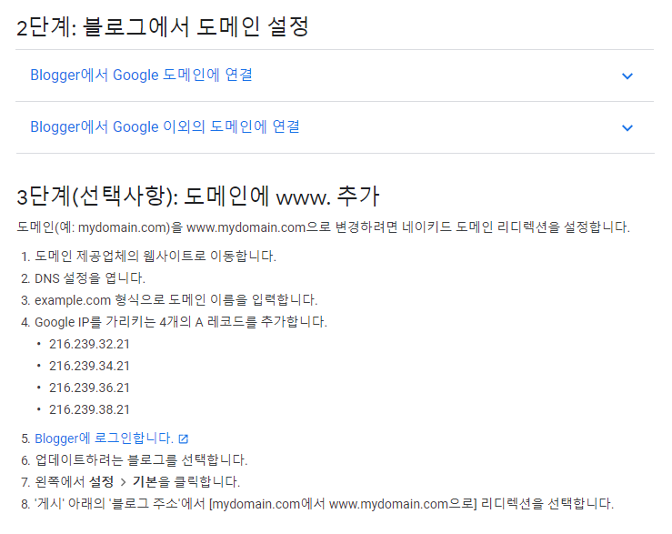 구글 블로그스팟은 최상위 도메인을 연결할 때 A레코드와 CNAME 레코드를 설정해야 합니다. 이 단계에서 구글이 제공하는 IP 주소와 ghs.google.com을 입력하게 됩니다.