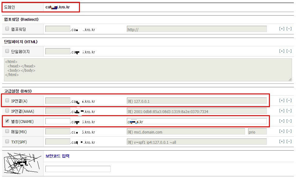 이 경우 내도메인.한국 dns 고급 설정에서 Cname을 이용하면 된다.