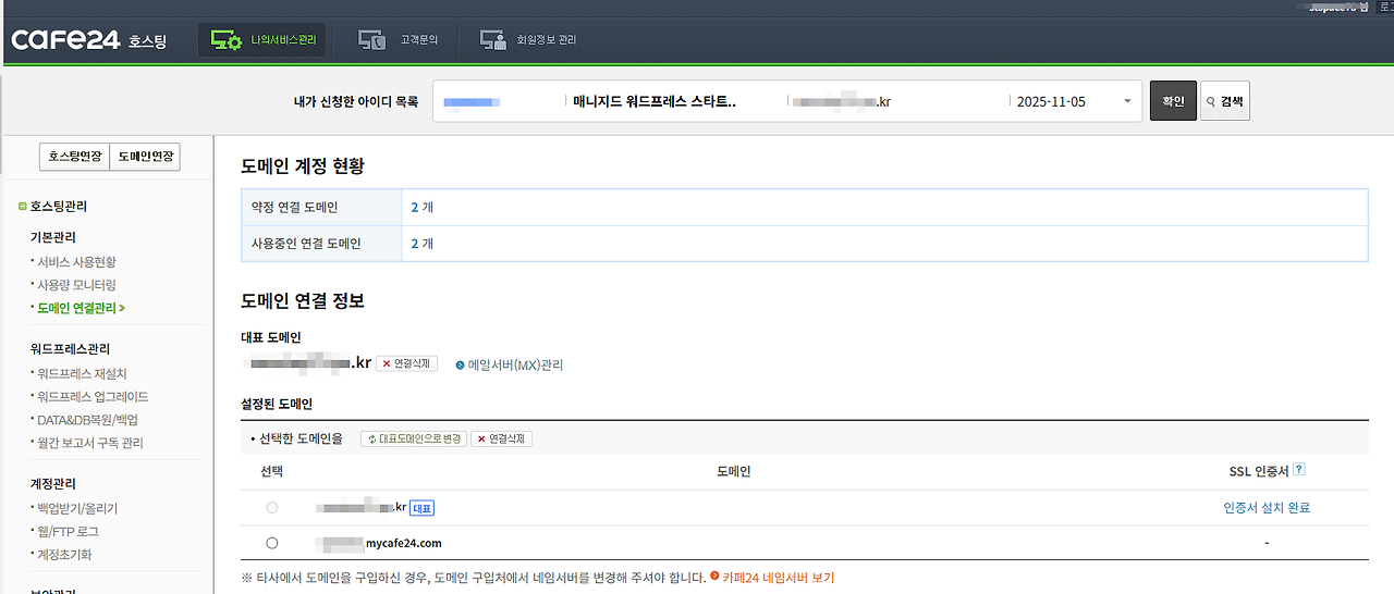 매니지드 워드프레스 카페24 2차 도메인 주소로 설정하기