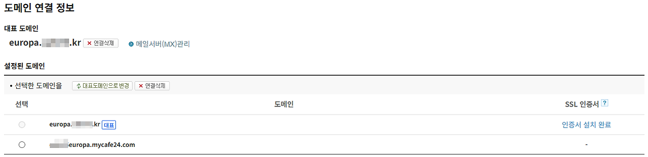 카페24의 도메인을 1차 주소로 사용하는 경우, 카페24 호스팅 관리 페이지에서 도메인 연결 관리로 들어가 직접 도메인을 등록할 수 있습니다.