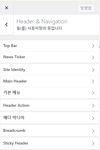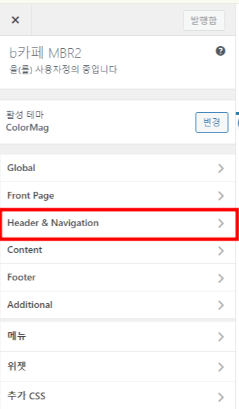 - 사이트 아이덴티티로 이동: '사용자 정의하기' 메뉴에서 '사이트 아이덴티티(Site Identity)'를 선택합니다. 가끔은 바로 사이트 아이덴티티가 안보이는 테마도 있습니다. 이럴 때는 Header & Navigation 같은 데를 열어 보면 됩니다.