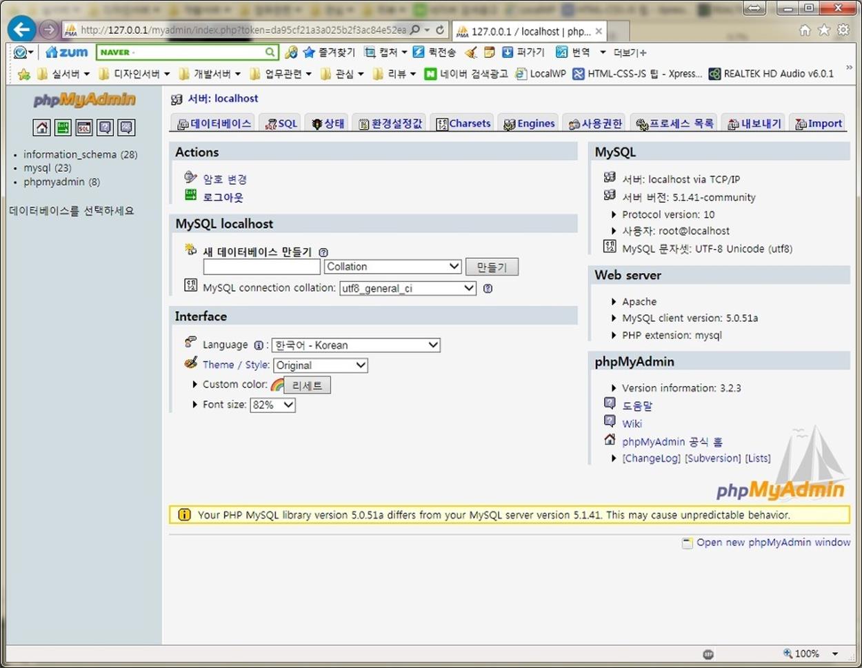 http://127.0.0.1/myadmin으로 접속해서 phpMyAdmin을 이용해서 "새 데이터베이스 만들기"에 "wordpress"를 입력하고 새 데이터베이스를 생성해주어야 한다.( 따옴표 떼고 wordpress 만 입력!)