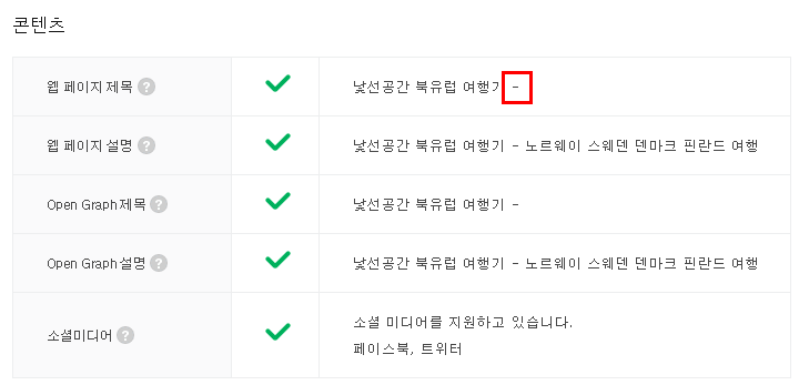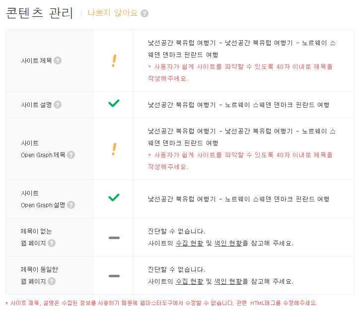 타이틀이 40자를 넘어가면 괘씸죄로 네이버 검색에서 통누락을 겪거나 웹문서 영역에서 사이트 메인이 누락되어 사이트 노출 어드밴티지를 포기해야 할 수가 있기 때문이다.