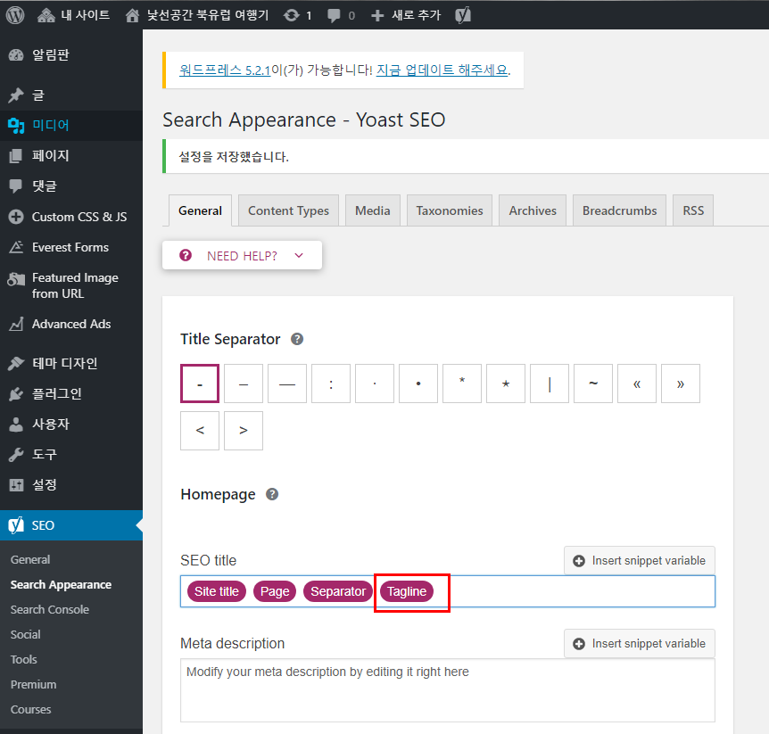 요스트SEO는 타이틀 메타를 구성할 때 사이트 타이틀에 구분자와 함께 태그라인을 함께 붙여 넣는다.