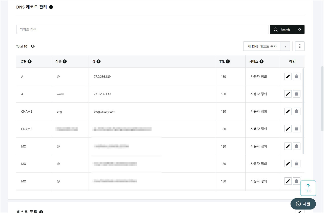 host.tistory.io또는blog.tistory.com중 하나를 입력합니다. - 설정이 완료되면 티스토리의 '개인 도메인 설정'에서 도메인을 입력하면 설정이 완료됩니다.