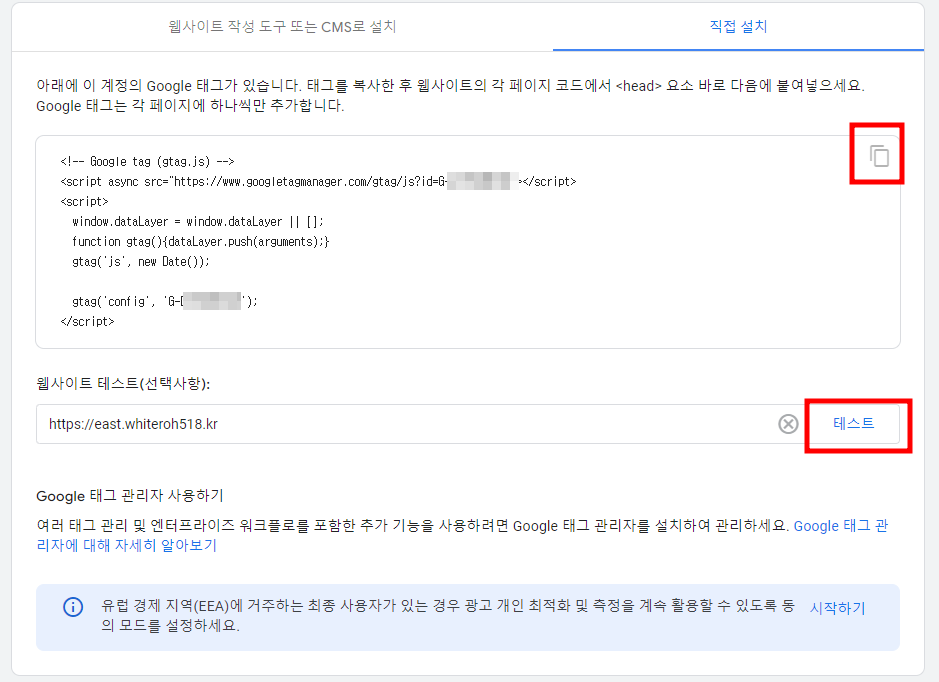 '태그 안내보기'를 클릭하면 두 가지 설치 방법이 나타납니다: 'CMS 설치'와 '직접 설치'입니다. 직접 설치를 선택하면 구글 애널리틱스에서 제공하는 태그 코드를 복사할 수 있습니다.
