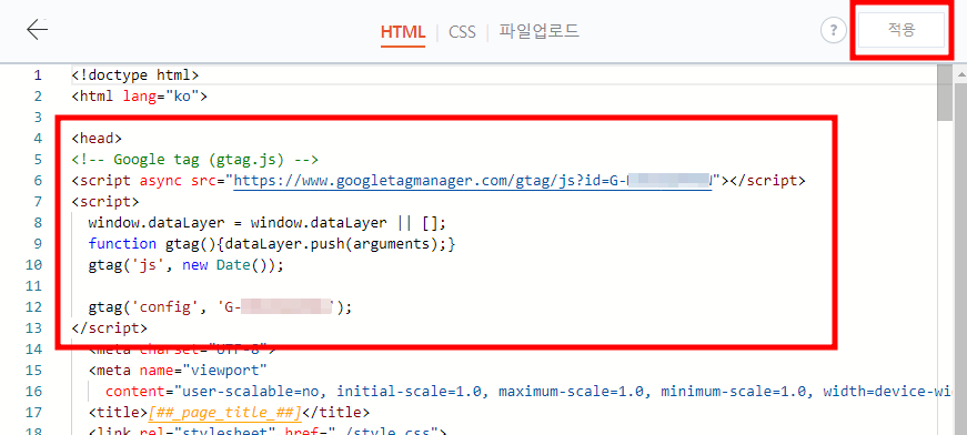<head>태그 바로 아래에 엔터를 치고, 복사한 태그 코드를 붙여 넣습니다. - 변경 사항을 저장하기 위해 '적용' 버튼을 클릭합니다.