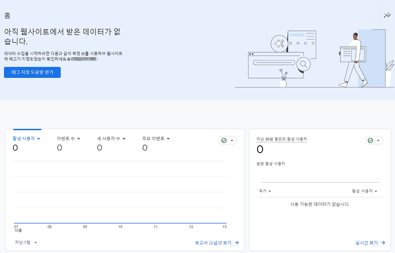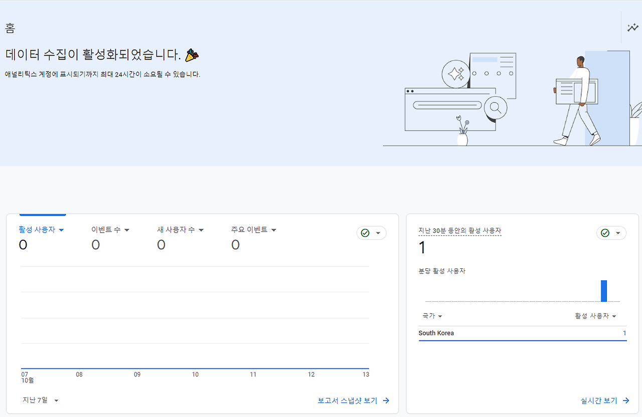 이 문구가 뜨기까지는 약간의 시간이 소요될 수 있습니다. 때로는 24시간 이내에 데이터가 수집되기 시작할 수 있으니, 인내심을 가지고 기다려주세요.