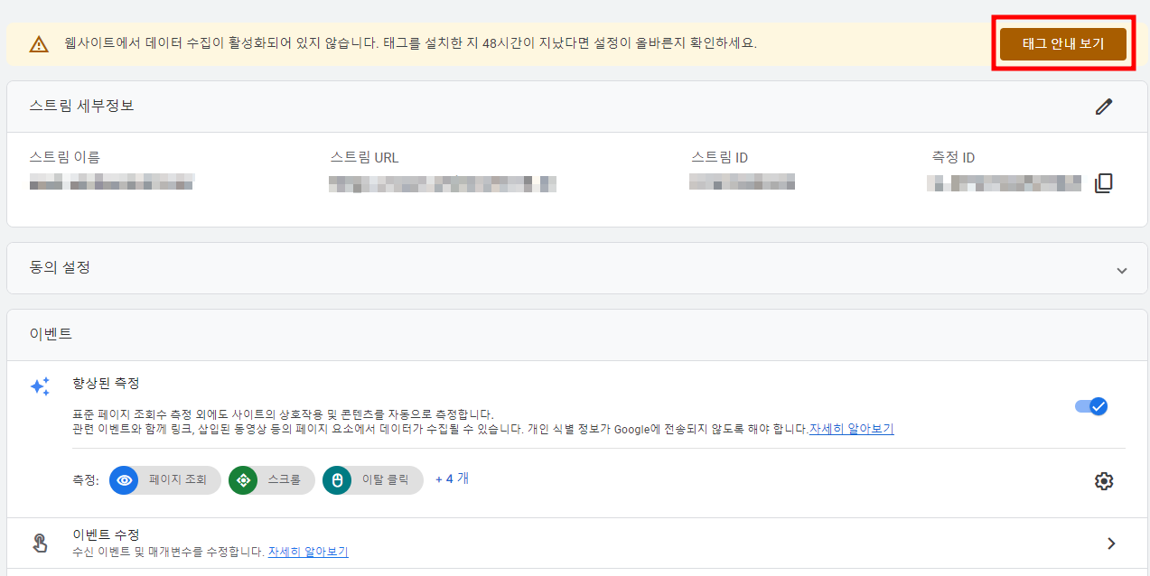 - 데이터 스트림을 클릭하면 경고 알림 창이 나타납니다. 여기서 '태그 안내보기'를 클릭합니다.