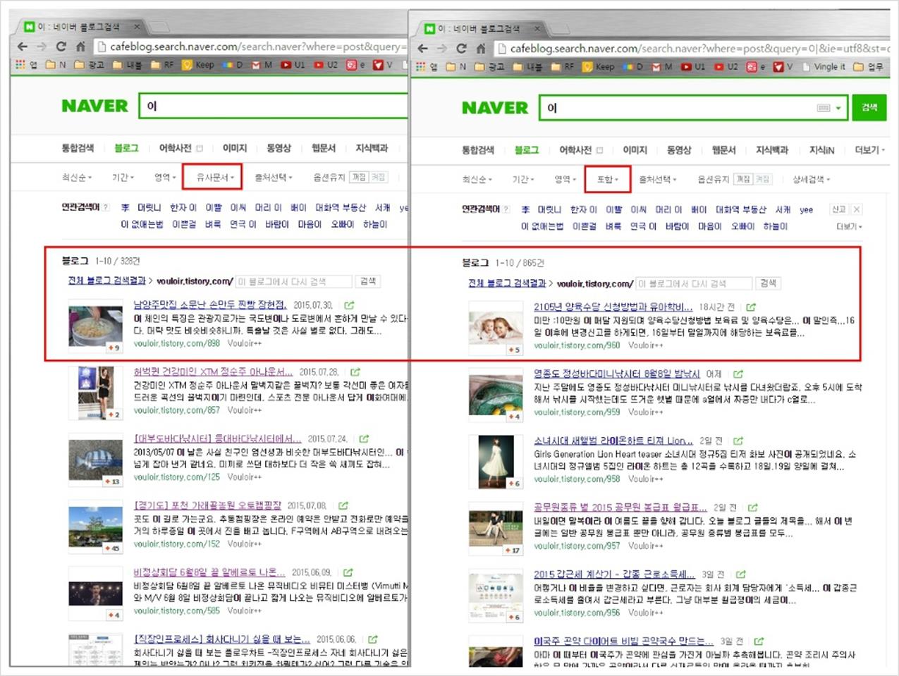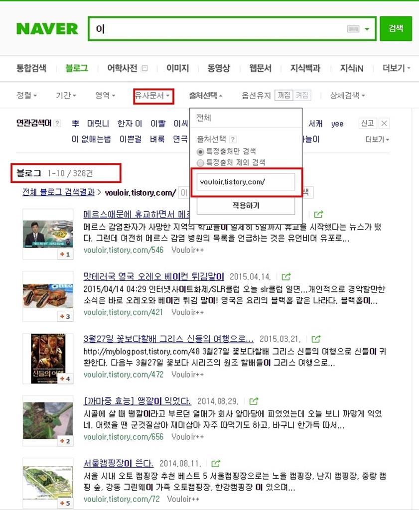 두 개의 탭이나 창을 열어서 한쪽에는 유사문서를 포함하지 않고, 한쪽은 유사문서 포함으로 정렬시키면, 블로그 글의 개수가 다름을 볼 수 있습니다.
