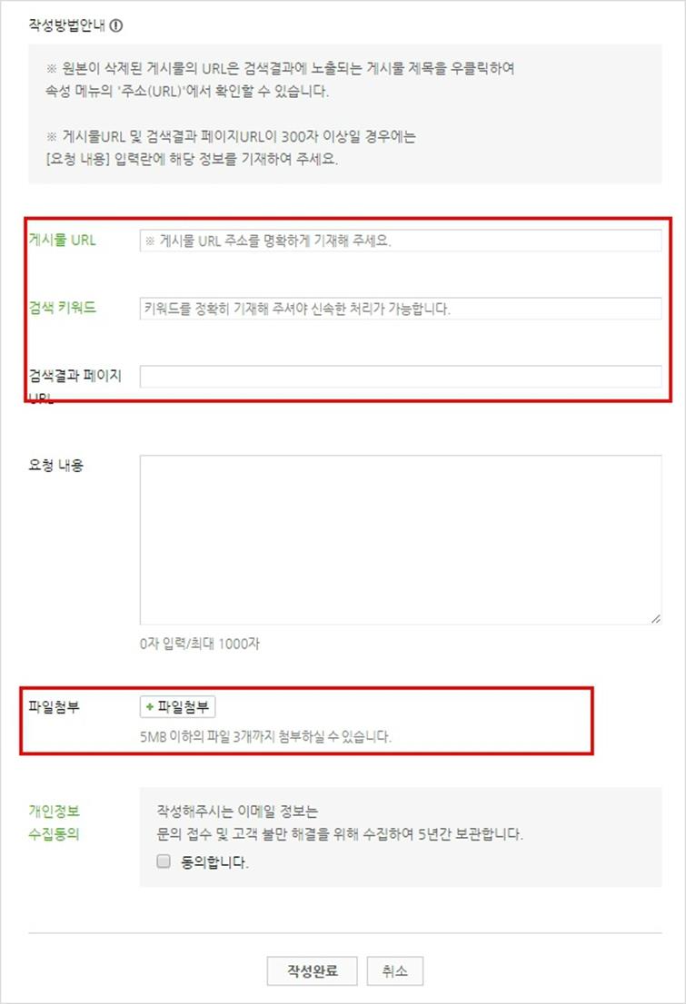 게시물이 삭제되었을 경우를 선택하고, 예 삭제된 것을 확인하였습니다를 선택하면 다음과 같은 입력 폼이 나옵니다.