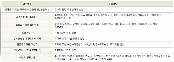 1순위 - 생계의료급여수급가구, 주거지원 시급 가구, 보호대상 한부모가족, 아동보호시설퇴소자, 월평균 소득 70% 이하 장애인 가구, 대학생 및 취업준비생.
