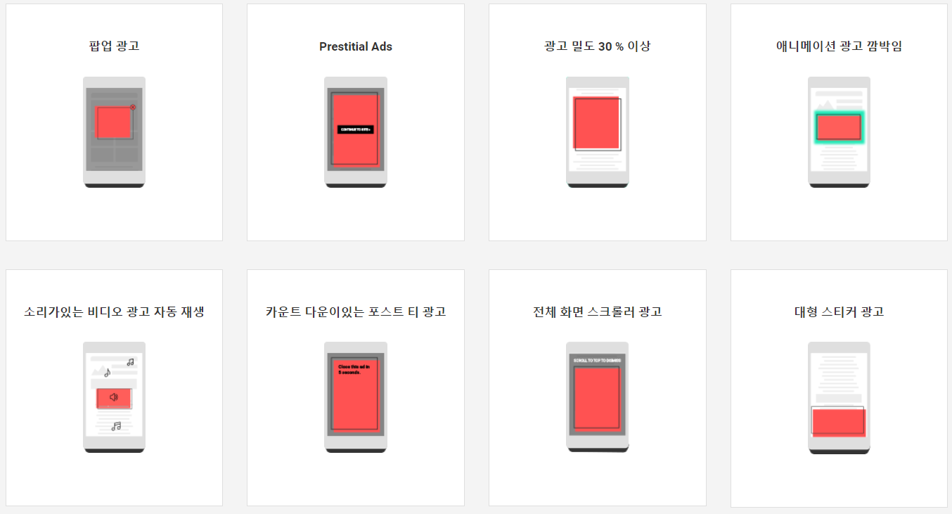 - 화면을 절반 이상 차지하는 광고: 특히 콘텐츠를 가리는 큰 사이즈의 광고는 금지됩니다.