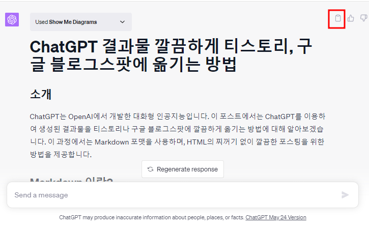 ChatGPT에서 생성된 결과물을 Markdown으로 변환하는 과정은 다음과 같습니다. 직접할 필요 없습니다. 결과물 옆의 클립보드 복사 버튼을 클릭하면 마크다운으로 복사가 됩니다.
